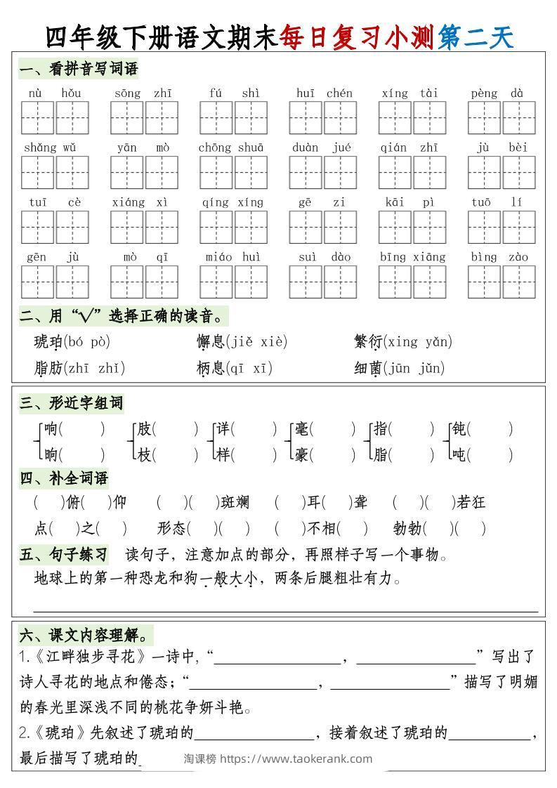 四下语文期末1-8单元复习8天小测-含答案taoke4个月前发布关注5710四下语文期末1-8单元复习8天小测-含答案此内容为付费资源,请付费后查看9.919.9月VIP免费永久VIP免费立即购买您当前未登录!建议登陆后购买,可保存购买订单格式pdf页数16 页大小1.77 MB付费资源 ——预览已结束,还剩14页未读——开通会员后可免费下载高清完整文档 © 版权声明文章版权归作者所有,未经允许请勿转载。THE END小学语文 喜欢就支持一下吧点赞10收藏