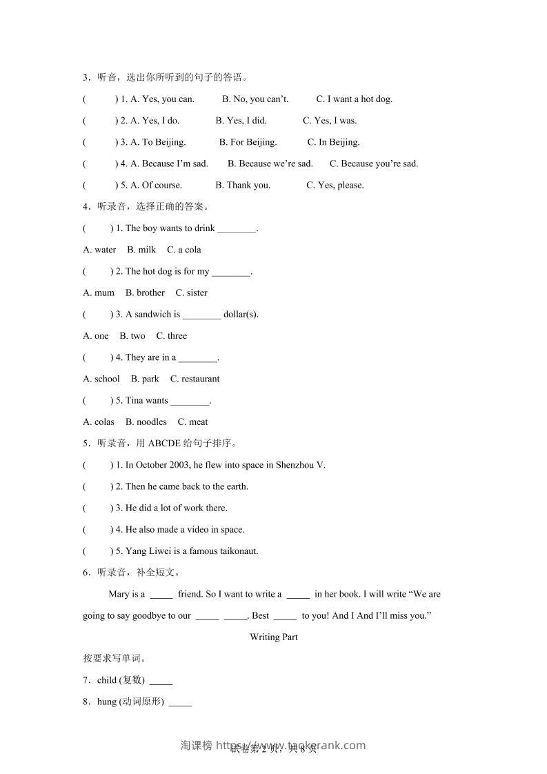 2024-2025学年六年级英语下学期期末全真模拟(外研版三起)英语(基础卷02)taoke3个月前发布关注4262024-2025学年六年级英语下学期期末全真模拟(外研版三起)英语(基础卷02)此内容为付费资源,请付费后查看9.919.9月VIP免费永久VIP免费立即购买您当前未登录!建议登陆后购买,可保存购买订单格式pdf页数14 页大小1.24 MB付费资源 ——预览已结束,还剩12页未读——开通会员后可免费下载高清完整文档 © 版权声明文章版权归作者所有,未经允许请勿转载。THE END小学英语 喜欢就支持一下吧点赞6收藏