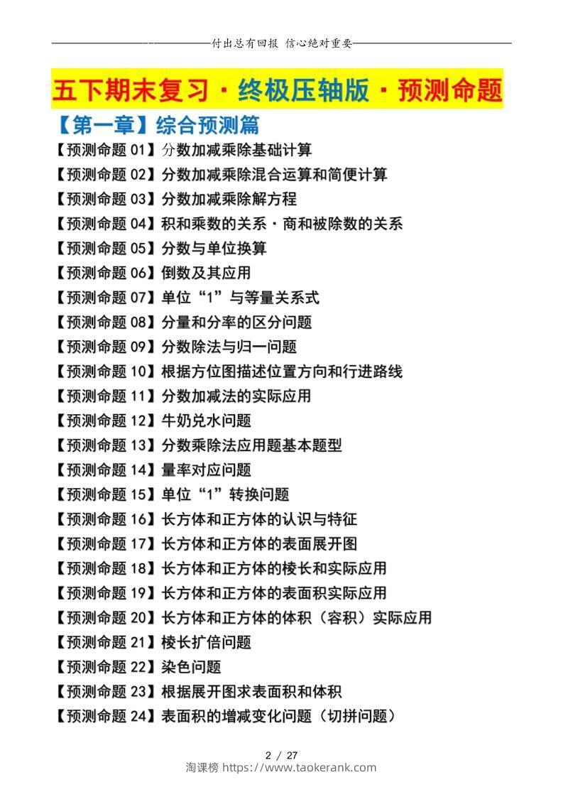 五下数学期末复习·终极压轴版(原卷版)北师大版taoke3个月前发布关注316五下数学期末复习·终极压轴版(原卷版)北师大版此内容为付费资源,请付费后查看9.919.9月VIP免费永久VIP免费立即购买您当前未登录!建议登陆后购买,可保存购买订单格式pdf页数27 页大小2.99 MB付费资源 ——预览已结束,还剩25页未读——开通会员后可免费下载高清完整文档 © 版权声明文章版权归作者所有,未经允许请勿转载。THE END小学数学 喜欢就支持一下吧点赞6收藏