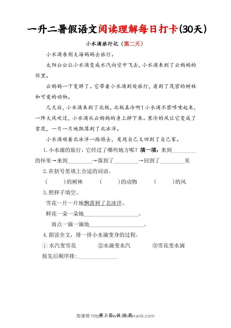 一升二暑假语文阅读理解每日打卡30天(含答案38页)一下语文taoke3个月前发布关注429一升二暑假语文阅读理解每日打卡30天(含答案38页)一下语文此内容为付费资源,请付费后查看9.919.9月VIP免费永久VIP免费立即购买您当前未登录!建议登陆后购买,可保存购买订单格式pdf页数38 页大小969.16 KB付费资源 ——预览已结束,还剩36页未读——开通会员后可免费下载高清完整文档 © 版权声明文章版权归作者所有,未经允许请勿转载。THE END小学语文 喜欢就支持一下吧点赞9收藏