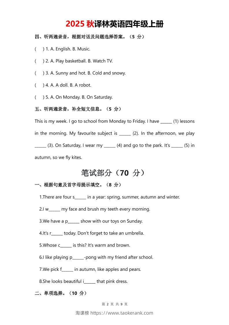 2025年秋译林版四上英语期末测试卷(无音频)taoke2个月前发布关注5362025年秋译林版四上英语期末测试卷(无音频)此内容为付费资源,请付费后查看9.919.9月VIP免费永久VIP免费立即购买您当前未登录!建议登陆后购买,可保存购买订单格式pdf页数9 页大小254.58 KB付费资源 ——预览已结束,还剩7页未读——开通会员后可免费下载高清完整文档 © 版权声明文章版权归作者所有,未经允许请勿转载。THE END小学英语 喜欢就支持一下吧点赞6收藏