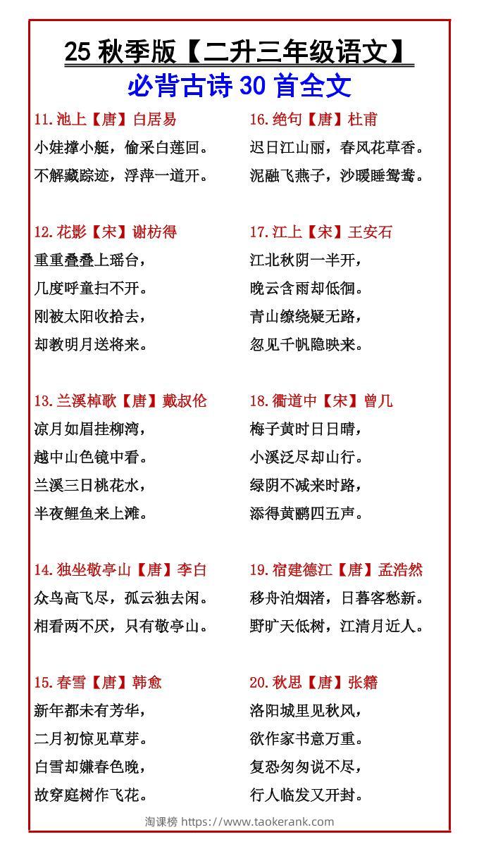 【2025秋新版】【二升三年级语文】必背古诗30首全文-三上语文taoke2个月前发布关注5611【2025秋新版】【二升三年级语文】必背古诗30首全文-三上语文此内容为付费资源,请付费后查看9.919.9月VIP免费永久VIP免费立即购买您当前未登录!建议登陆后购买,可保存购买订单格式pdf页数6 页大小164.64 KB付费资源 ——预览已结束,还剩4页未读——开通会员后可免费下载高清完整文档 © 版权声明文章版权归作者所有,未经允许请勿转载。THE END小学语文 喜欢就支持一下吧点赞11收藏
