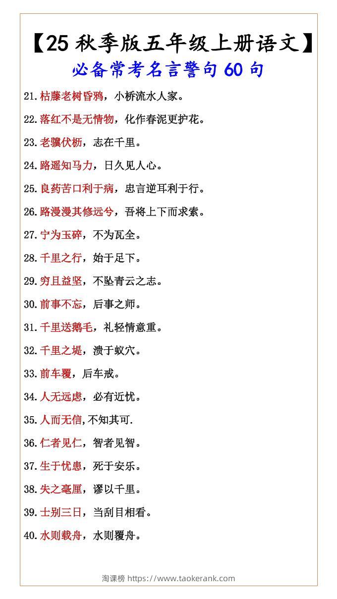【2025秋新版】【五年级上册语文】必备常考名言警句60句taoke2个月前发布关注4014【2025秋新版】【五年级上册语文】必备常考名言警句60句此内容为付费资源,请付费后查看9.919.9月VIP免费永久VIP免费立即购买您当前未登录!建议登陆后购买,可保存购买订单格式pdf页数3 页大小82.97 KB付费资源 ——预览已结束,还剩1页未读——开通会员后可免费下载高清完整文档 © 版权声明文章版权归作者所有,未经允许请勿转载。THE END小学语文 喜欢就支持一下吧点赞14收藏