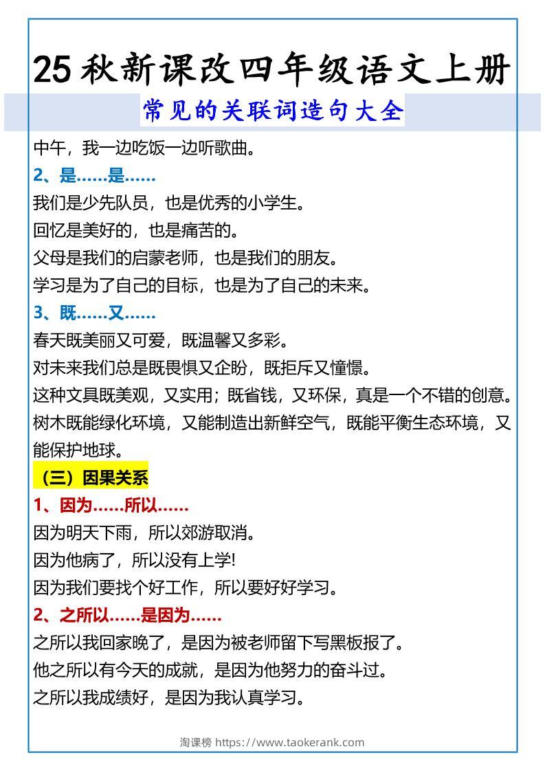 【2025秋新版】四年级语文上册常见的关联词造句大全taoke2个月前发布关注5114【2025秋新版】四年级语文上册常见的关联词造句大全此内容为付费资源,请付费后查看9.919.9月VIP免费永久VIP免费立即购买您当前未登录!建议登陆后购买,可保存购买订单格式pdf页数3 页大小170.25 KB付费资源 ——预览已结束,还剩1页未读——开通会员后可免费下载高清完整文档 © 版权声明文章版权归作者所有,未经允许请勿转载。THE END小学语文 喜欢就支持一下吧点赞14收藏
