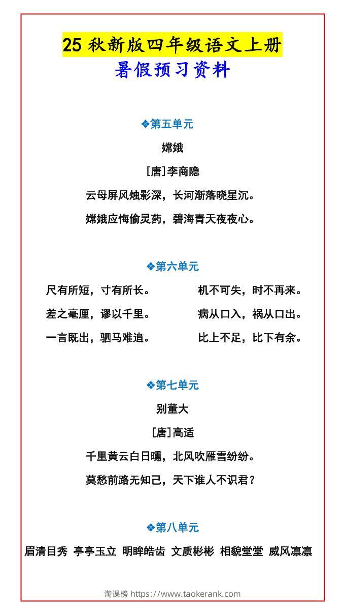【2025秋新版】四年级语文上册暑假预习资料taoke2个月前发布关注4314【2025秋新版】四年级语文上册暑假预习资料此内容为付费资源,请付费后查看9.919.9月VIP免费永久VIP免费立即购买您当前未登录!建议登陆后购买,可保存购买订单格式pdf页数5 页大小126.22 KB付费资源 ——预览已结束,还剩3页未读——开通会员后可免费下载高清完整文档 © 版权声明文章版权归作者所有,未经允许请勿转载。THE END小学语文 喜欢就支持一下吧点赞14收藏
