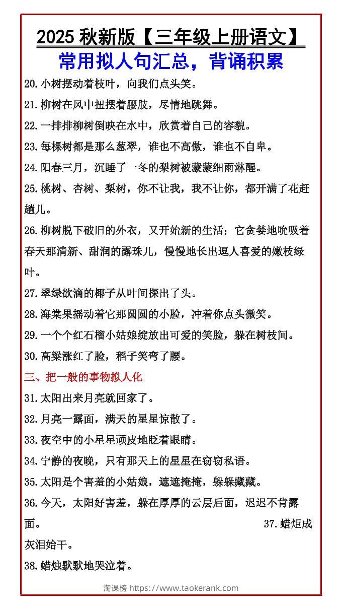 【2025秋新版】【三年级上册语文】常用拟人句汇总,背诵积累taoke2个月前发布关注438【2025秋新版】【三年级上册语文】常用拟人句汇总,背诵积累此内容为付费资源,请付费后查看9.919.9月VIP免费永久VIP免费立即购买您当前未登录!建议登陆后购买,可保存购买订单格式pdf页数3 页大小111.93 KB付费资源 ——预览已结束,还剩1页未读——开通会员后可免费下载高清完整文档 © 版权声明文章版权归作者所有,未经允许请勿转载。THE END小学语文 喜欢就支持一下吧点赞8收藏