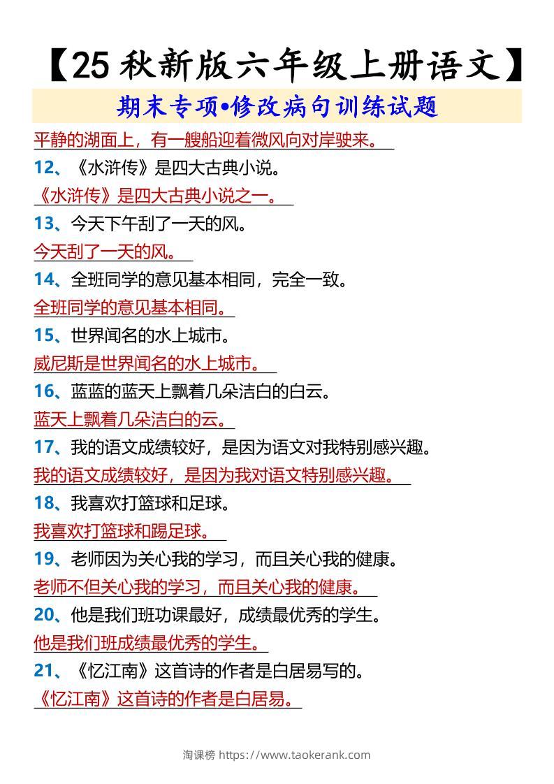 【2025秋新版】【六年级上册语文】期末专项•修改病句训练试题taoke2个月前发布关注3514【2025秋新版】【六年级上册语文】期末专项•修改病句训练试题此内容为付费资源,请付费后查看9.919.9月VIP免费永久VIP免费立即购买您当前未登录!建议登陆后购买,可保存购买订单格式pdf页数4 页大小173.49 KB付费资源 ——预览已结束,还剩2页未读——开通会员后可免费下载高清完整文档 © 版权声明文章版权归作者所有,未经允许请勿转载。THE END小学语文 喜欢就支持一下吧点赞14收藏