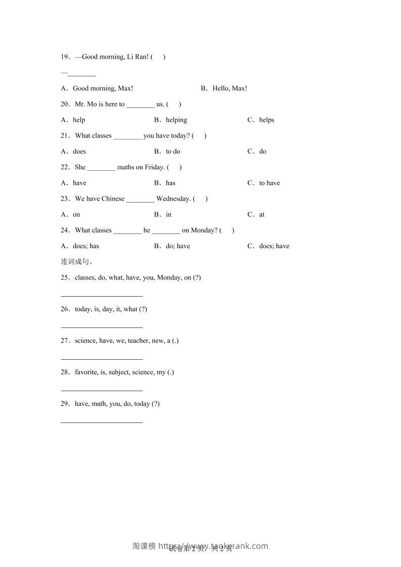2025-2026学年北师大版(2024)英语四年级上册Unit1BacktoschoolLesson2基础练习(同步练)taoke1个月前发布关注48112025-2026学年北师大版(2024)英语四年级上册Unit1BacktoschoolLesson2基础练习(同步练)此内容为付费资源,请付费后查看9.919.9月VIP免费永久VIP免费立即购买您当前未登录!建议登陆后购买,可保存购买订单格式pdf页数5 页大小125.50 KB付费资源 ——预览已结束,还剩3页未读——开通会员后可免费下载高清完整文档 © 版权声明文章版权归作者所有,未经允许请勿转载。THE END小学英语 喜欢就支持一下吧点赞11收藏