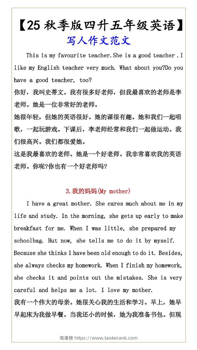 【2025秋新版】【四升五年级英语】写人作文范文-五上英语taoke1个月前发布关注3615【2025秋新版】【四升五年级英语】写人作文范文-五上英语此内容为付费资源,请付费后查看9.919.9月VIP免费永久VIP免费立即购买您当前未登录!建议登陆后购买,可保存购买订单格式pdf页数3 页大小69.44 KB付费资源 ——预览已结束,还剩1页未读——开通会员后可免费下载高清完整文档 © 版权声明文章版权归作者所有,未经允许请勿转载。THE END小学英语 喜欢就支持一下吧点赞15收藏