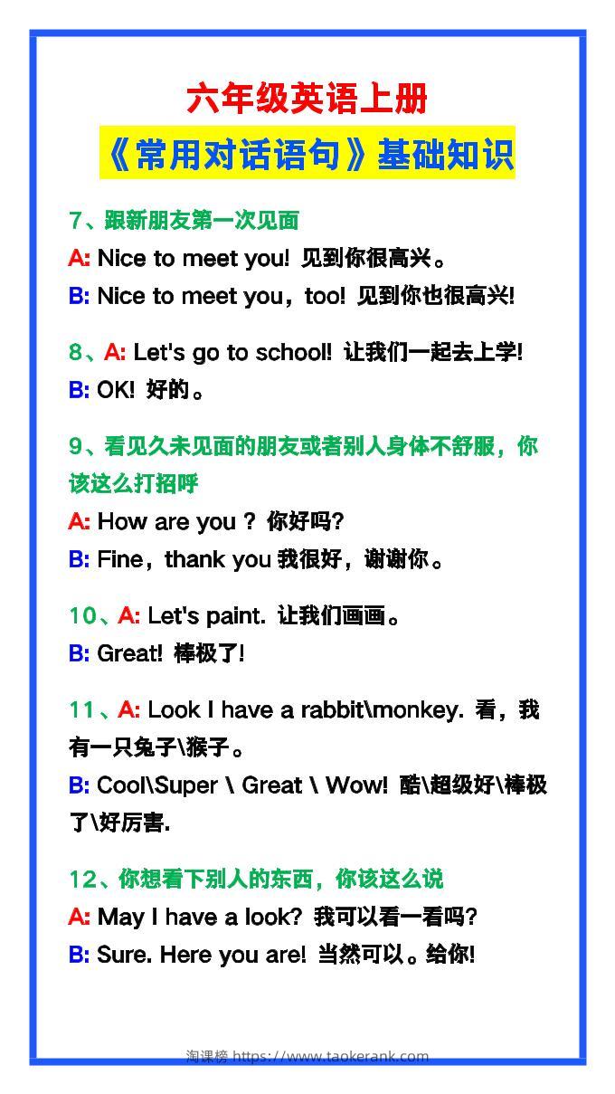 【2025秋新版】六年级英语上册《常用对话语句》taoke1个月前发布关注3911【2025秋新版】六年级英语上册《常用对话语句》此内容为付费资源,请付费后查看9.919.9月VIP免费永久VIP免费立即购买您当前未登录!建议登陆后购买,可保存购买订单格式pdf页数3 页大小37.65 KB付费资源 ——预览已结束,还剩1页未读——开通会员后可免费下载高清完整文档 © 版权声明文章版权归作者所有,未经允许请勿转载。THE END小学英语 喜欢就支持一下吧点赞11收藏