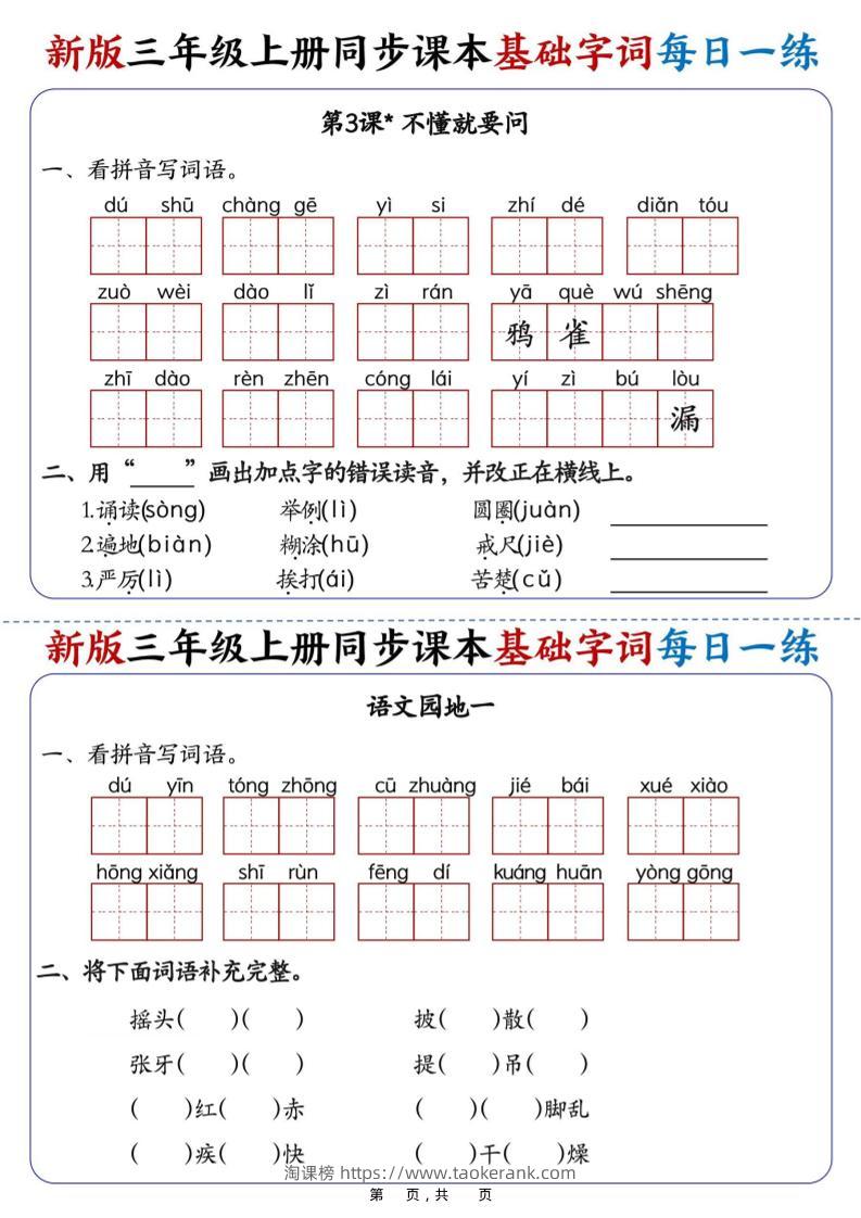 25新三上语文同步课本基础字词每日一练(含答案19页)taoke31天前发布关注42625新三上语文同步课本基础字词每日一练(含答案19页)此内容为付费资源,请付费后查看9.919.9月VIP免费永久VIP免费立即购买您当前未登录!建议登陆后购买,可保存购买订单格式pdf页数19 页大小8.02 MB付费资源 ——预览已结束,还剩17页未读——开通会员后可免费下载高清完整文档 © 版权声明文章版权归作者所有,未经允许请勿转载。THE END小学语文 喜欢就支持一下吧点赞6收藏