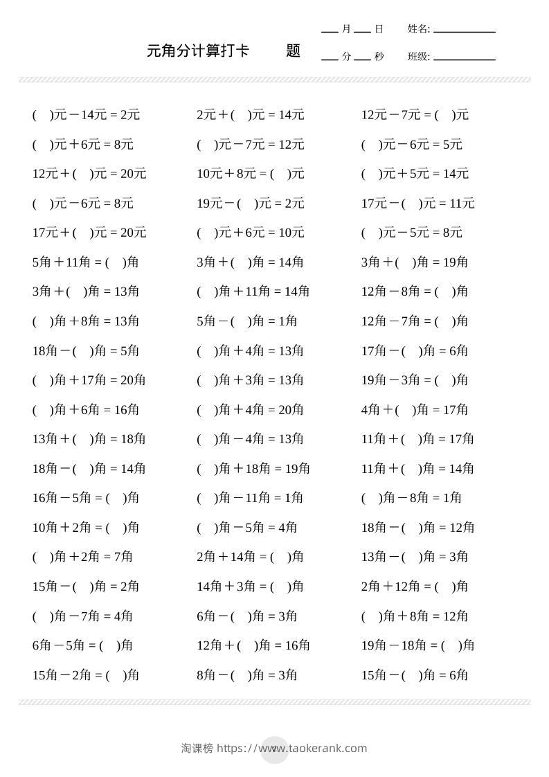 一上数学元角分计算专项练习1000题taoke24天前发布关注229一上数学元角分计算专项练习1000题此内容为付费资源,请付费后查看9.919.9月VIP免费永久VIP免费立即购买您当前未登录!建议登陆后购买,可保存购买订单格式pdf页数17 页大小1.69 MB付费资源 ——预览已结束,还剩15页未读——开通会员后可免费下载高清完整文档 © 版权声明文章版权归作者所有,未经允许请勿转载。THE END小学数学 喜欢就支持一下吧点赞9收藏