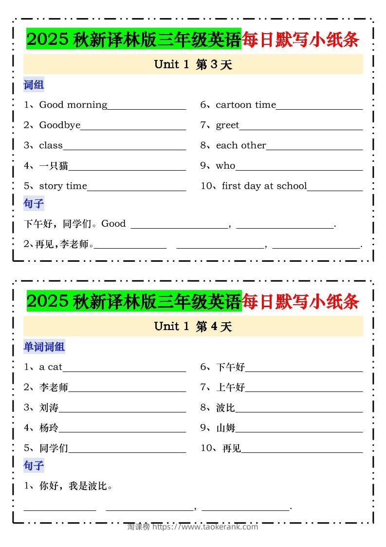 2025秋新译林版三年级英语每日默写小纸条-三上英语taoke2个月前发布关注56132025秋新译林版三年级英语每日默写小纸条-三上英语此内容为付费资源,请付费后查看9.919.9月VIP免费永久VIP免费立即购买您当前未登录!建议登陆后购买,可保存购买订单格式pdf页数24 页大小507.55 KB付费资源 ——预览已结束,还剩22页未读——开通会员后可免费下载高清完整文档 © 版权声明文章版权归作者所有,未经允许请勿转载。THE END小学英语 喜欢就支持一下吧点赞13收藏