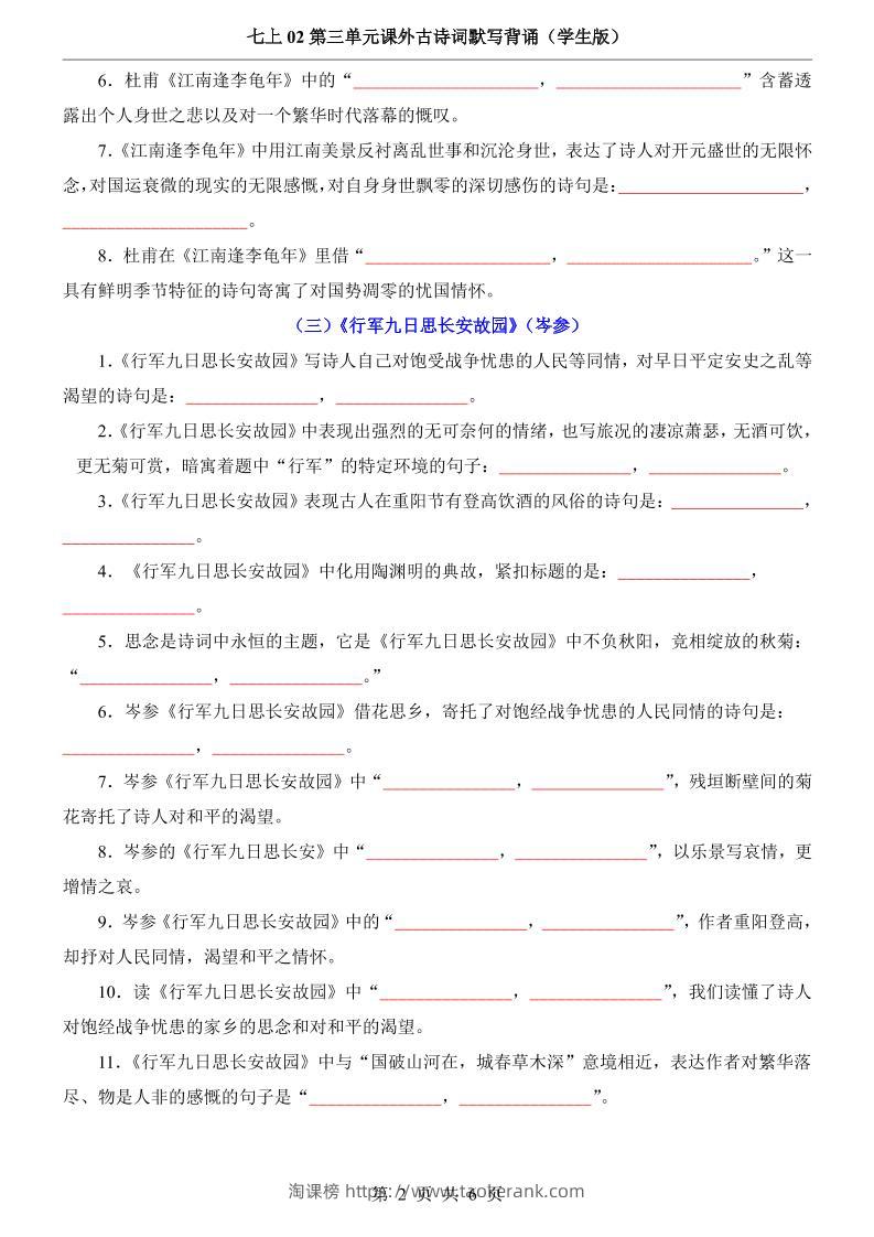 七年级上语文第3单元课外古诗词默写背诵taoke7天前发布关注4610七年级上语文第3单元课外古诗词默写背诵此内容为付费资源,请付费后查看9.919.9月VIP免费永久VIP免费立即购买您当前未登录!建议登陆后购买,可保存购买订单格式pdf页数6 页大小324.53 KB付费资源 ——预览已结束,还剩4页未读——开通会员后可免费下载高清完整文档 © 版权声明文章版权归作者所有,未经允许请勿转载。THE END初中语文 喜欢就支持一下吧点赞10收藏