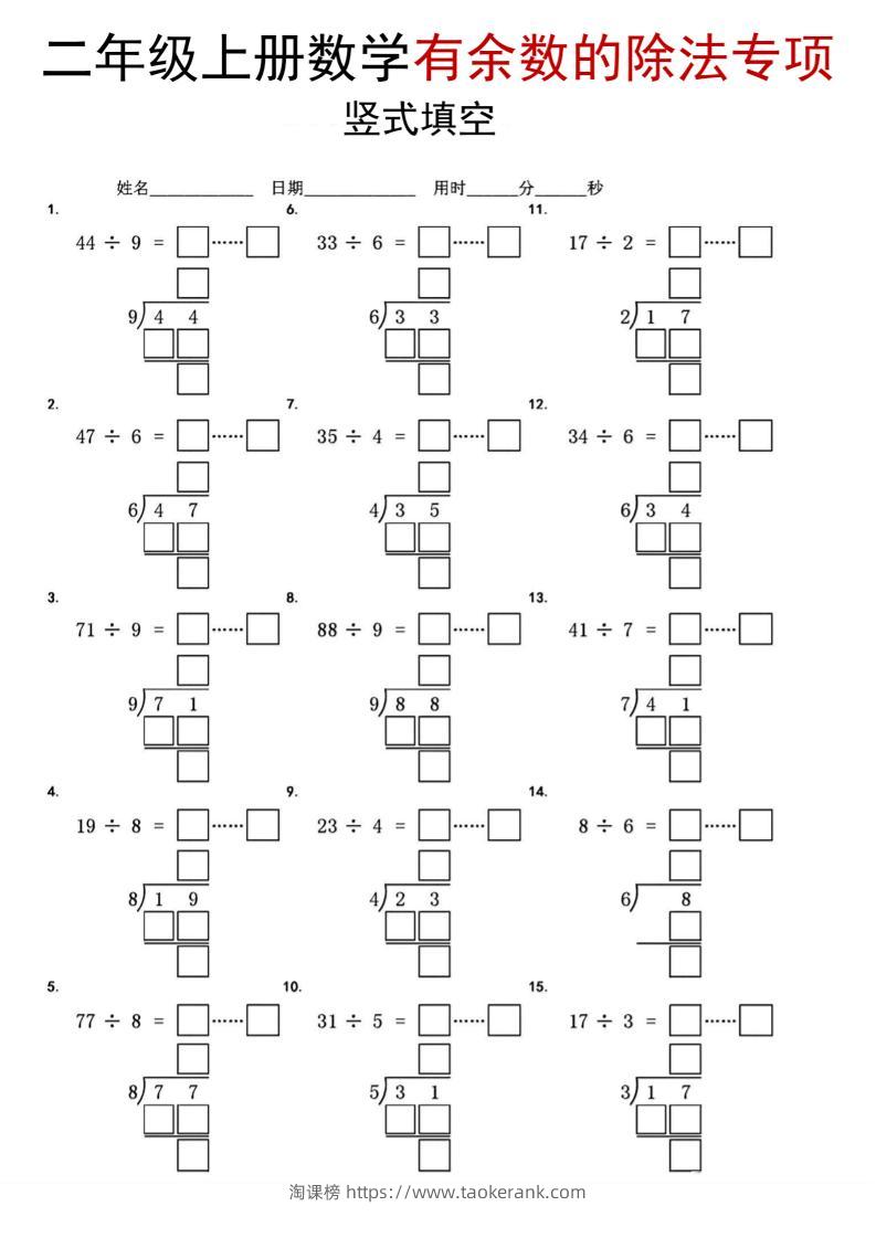 二年级上数学《有余数的除法》竖式填空专项taoke3天前发布关注3111二年级上数学《有余数的除法》竖式填空专项此内容为付费资源,请付费后查看9.919.9月VIP免费永久VIP免费立即购买您当前未登录!建议登陆后购买,可保存购买订单格式pdf页数7 页大小3.28 MB付费资源 ——预览已结束,还剩5页未读——开通会员后可免费下载高清完整文档 © 版权声明文章版权归作者所有,未经允许请勿转载。THE END小学数学 喜欢就支持一下吧点赞11收藏