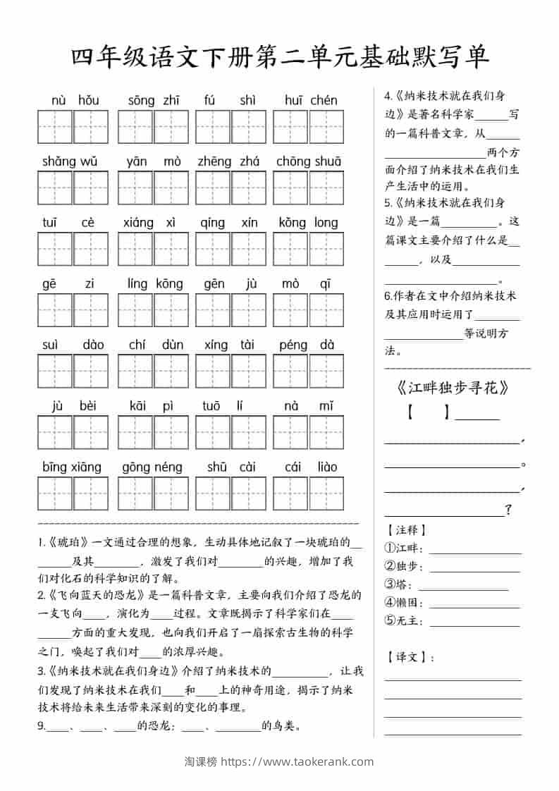 四年级下语文基础默写单(1-8单元)taoke9小时前发布关注466四年级下语文基础默写单(1-8单元)此内容为付费资源,请付费后查看9.919.9月VIP免费永久VIP免费立即购买您当前未登录!建议登陆后购买,可保存购买订单格式pdf页数8 页大小1.75 MB付费资源 ——预览已结束,还剩6页未读——开通会员后可免费下载高清完整文档 © 版权声明文章版权归作者所有,未经允许请勿转载。THE END小学语文 喜欢就支持一下吧点赞6收藏