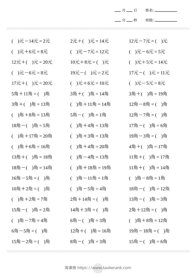 一年级下数学元角分计算专项练习1000题taoke7小时前发布关注288一年级下数学元角分计算专项练习1000题此内容为付费资源,请付费后查看9.919.9月VIP免费永久VIP免费立即购买您当前未登录!建议登陆后购买,可保存购买订单格式pdf页数17 页大小757.80 KB付费资源 ——预览已结束,还剩15页未读——开通会员后可免费下载高清完整文档 © 版权声明文章版权归作者所有,未经允许请勿转载。THE END小学数学 喜欢就支持一下吧点赞8收藏